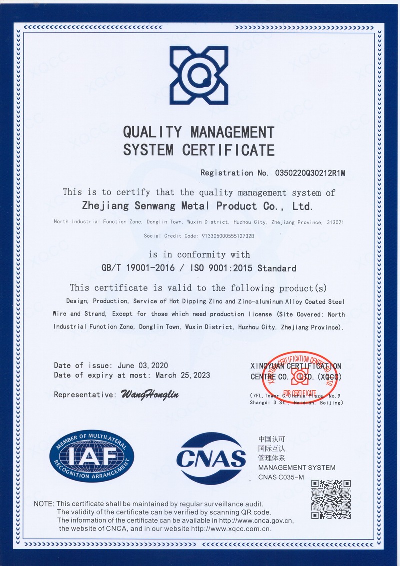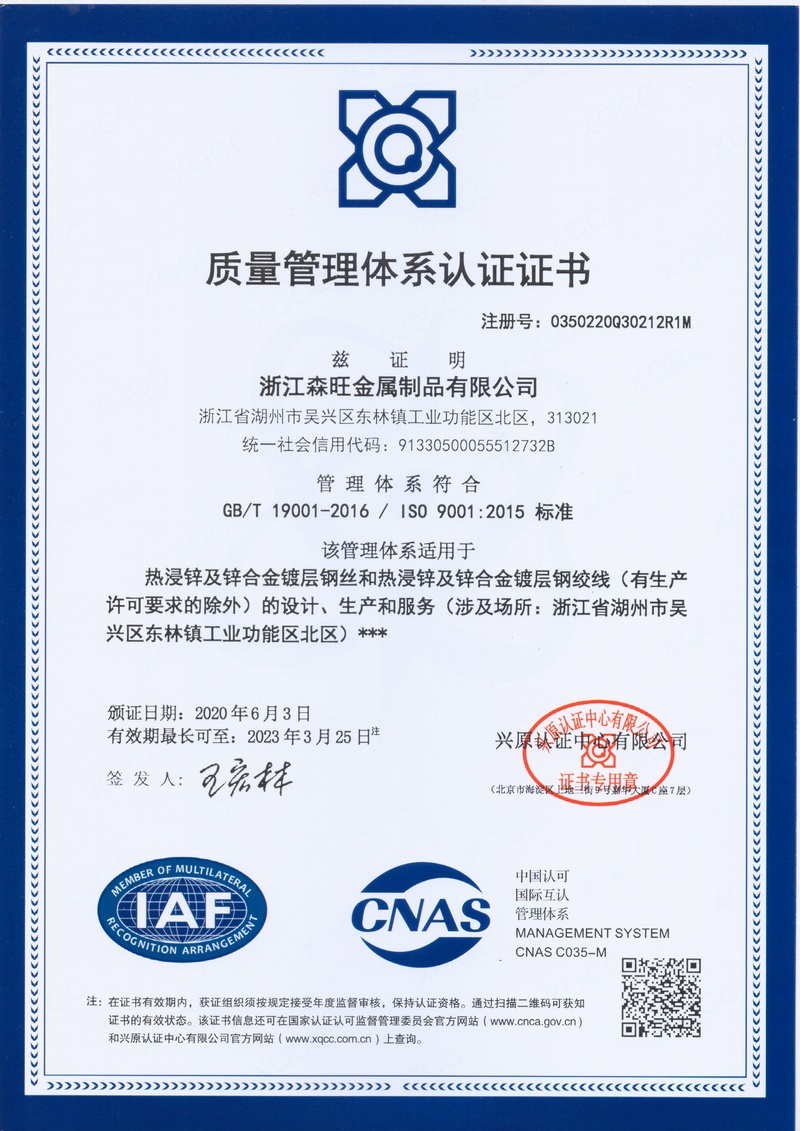 浙江森旺金屬制品有限公司成立于2012年,坐落湖州市吳興區(qū)東林鎮(zhèn)工業(yè)功能區(qū)。公司專業(yè)從事各類鍍鋅鋼絲、鋼絞線等產(chǎn)品的開發(fā)及生產(chǎn)。目前產(chǎn)品已廣泛應(yīng)用于各類通信光電纜,電力輸送,電氣化鐵路工程,各類堤壩防護(hù)及農(nóng)業(yè)溫室等工程領(lǐng)域。公司秉承“追求卓越品質(zhì),創(chuàng)建卓著信譽(yù)”的經(jīng)營(yíng)理念,始終堅(jiān)持專業(yè)化、規(guī)模化的經(jīng)營(yíng)模式。